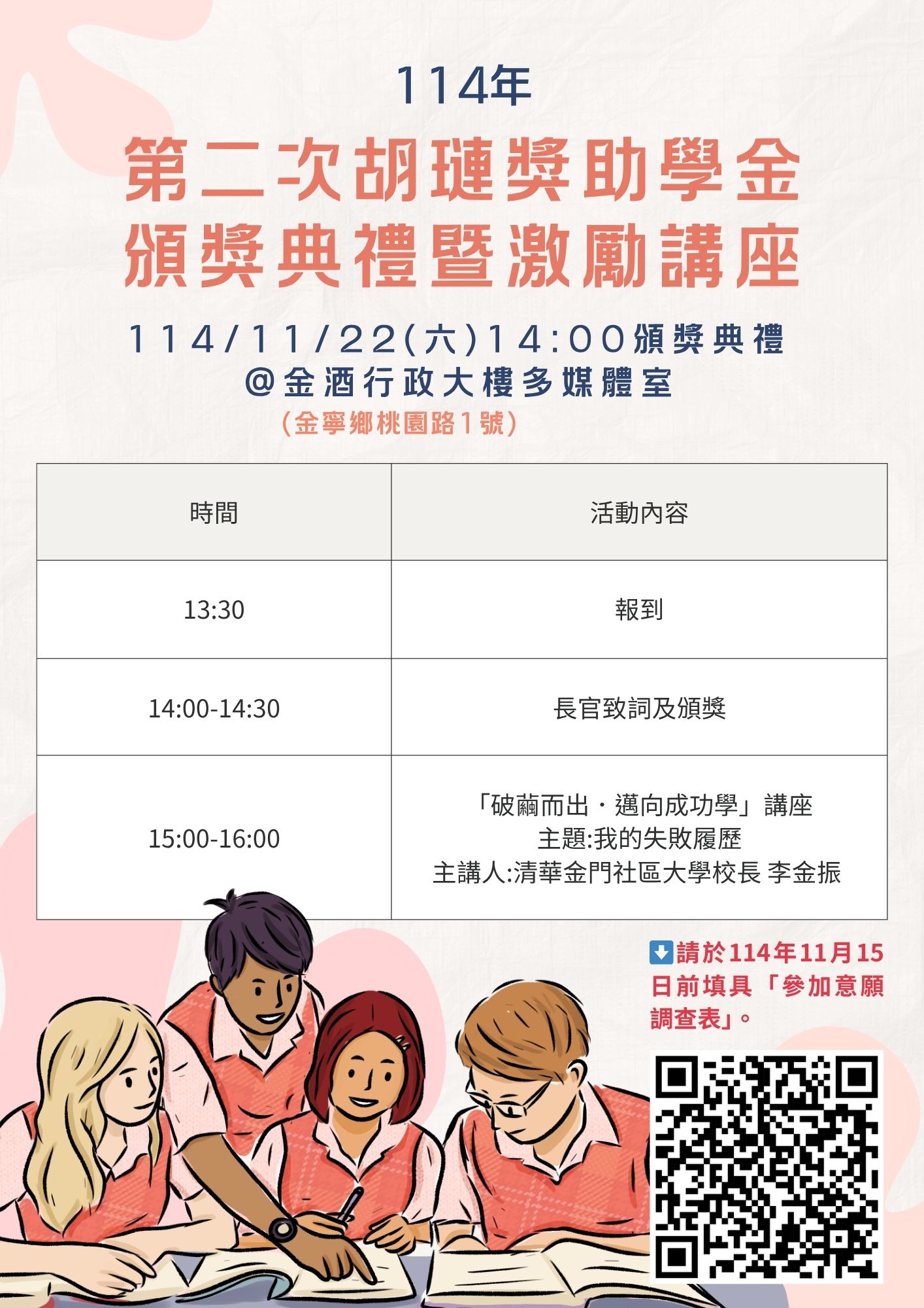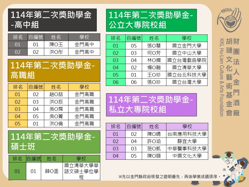 114 年第二次胡璉獎學金名單出爐!共計 83 位學子受惠,包括國小組 37 名、國中組 28 名、高中組 2 名、高職組 ( 含五專 1 ~ 3 年級 ) 5 名、公立大專院校組( 含二專與五專 4 ~ 5 年級 )6 名及私立大專院校組( 含二專與五專 4 ~ 5 年級 )4 名、研究所碩士班 5 名,為進一步鼓舞受獎者,於 11 月 22 日 (六) 下午 14:00 在金門酒廠行政大樓多媒體室舉辦頒獎典禮暨激勵講座。