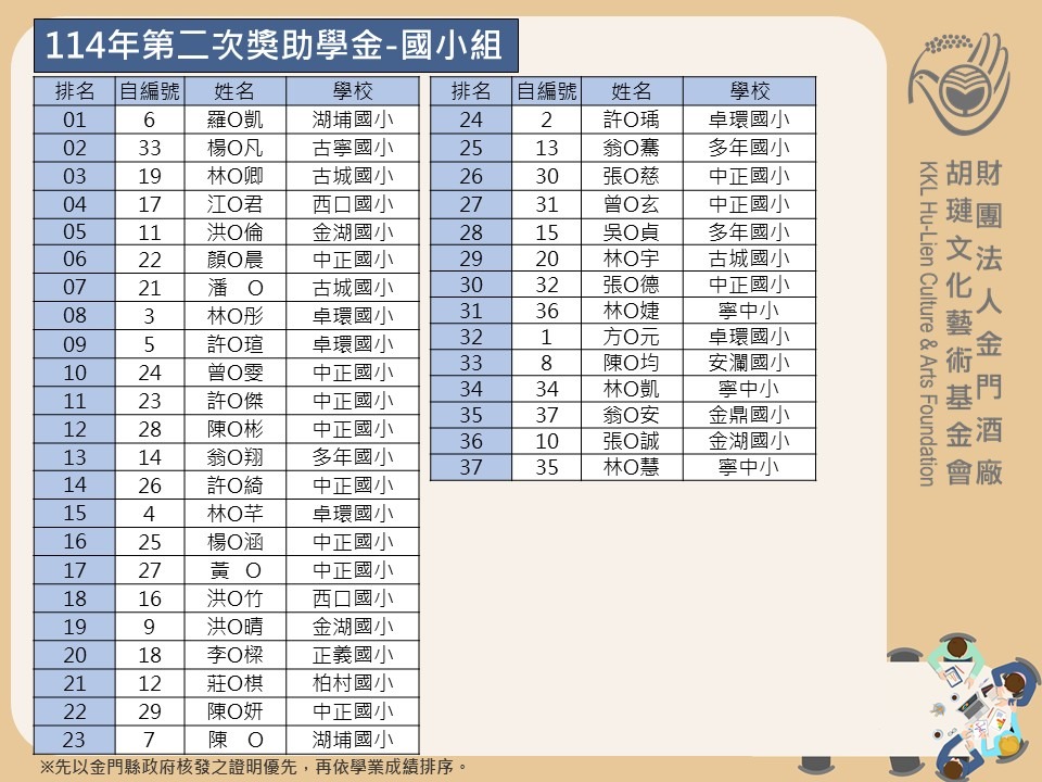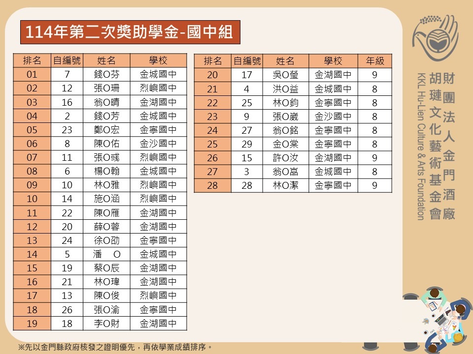 114 年第二次胡璉獎學金名單出爐!共計 83 位學子受惠,包括國小組 37 名、國中組 28 名、高中組 2 名、高職組 ( 含五專 1 ~ 3 年級 ) 5 名、公立大專院校組( 含二專與五專 4 ~ 5 年級 )6 名及私立大專院校組( 含二專與五專 4 ~ 5 年級 )4 名、研究所碩士班 5 名,為進一步鼓舞受獎者,於 11 月 22 日 (六) 下午 14:00 在金門酒廠行政大樓多媒體室舉辦頒獎典禮暨激勵講座。